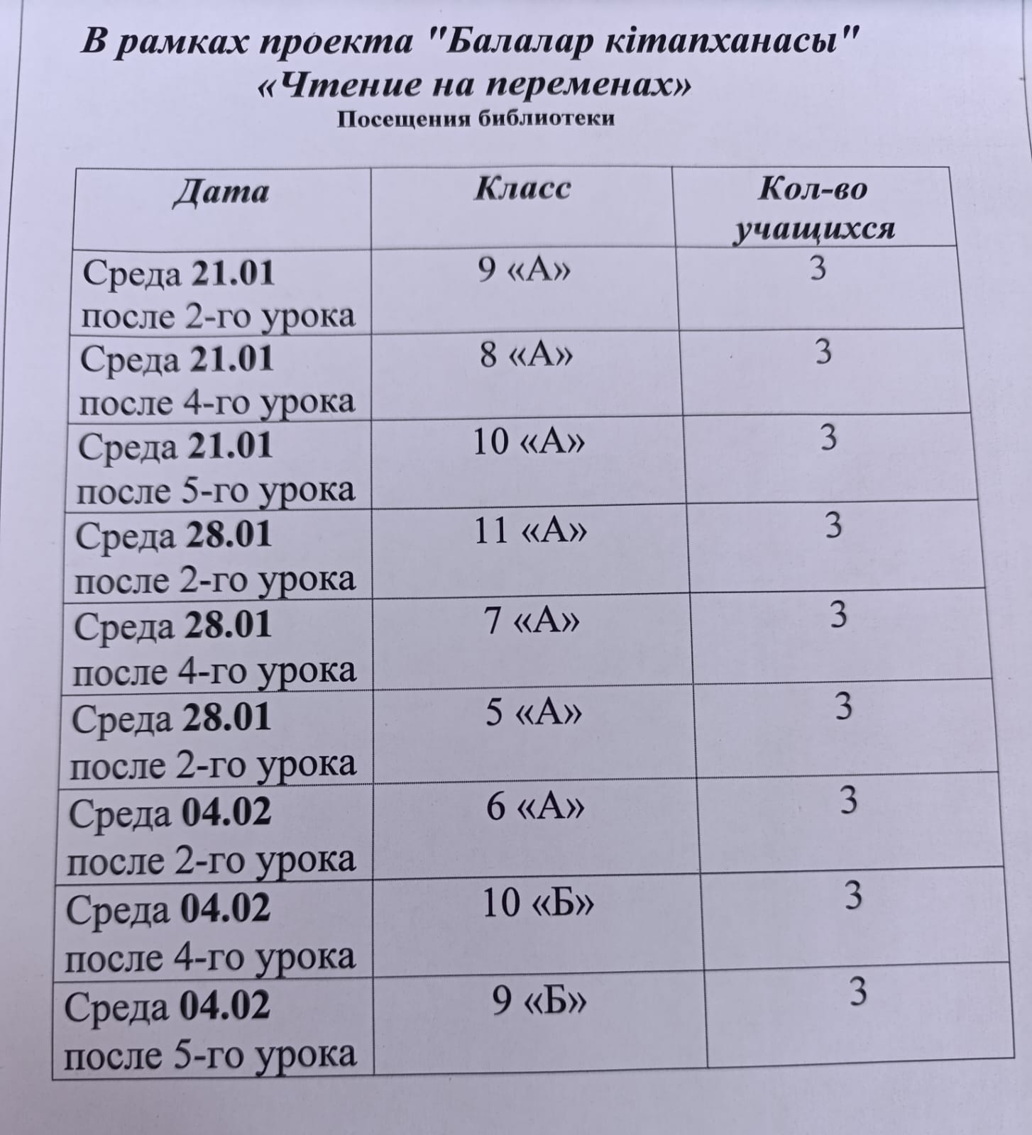 «Балалар кітапханасы» жобасының аясында және оқу мәдениетін дамытуға баса назар аудара отырып, біз оқуды мектеп өмірінің тұрақты және қызықты бөлігіне айналдыру үшін үзіліс кезінде мектеп кітапханасына бару кестесін жасадық.