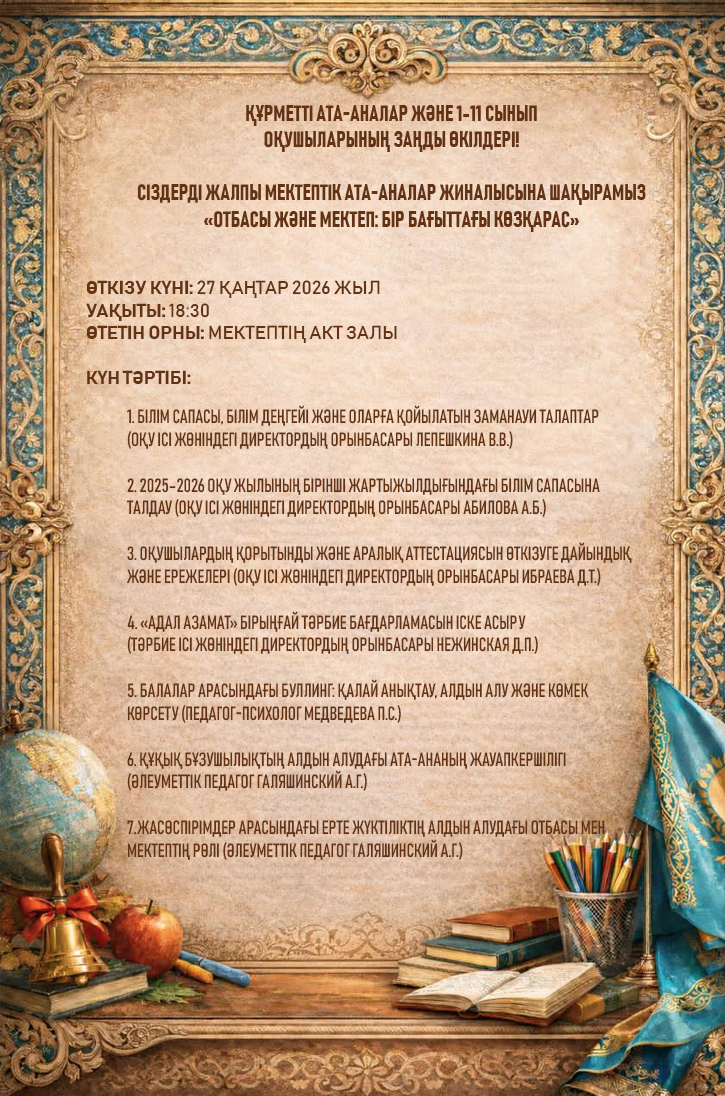 Сіздерді жалпы мектептік ата-аналар жиналысына шақырамыз «Отбасы және мектеп: бір бағыттағы көзқарас» Автор admin Оқылым мин Көріністер 4 Жариялаған 23/01/2026